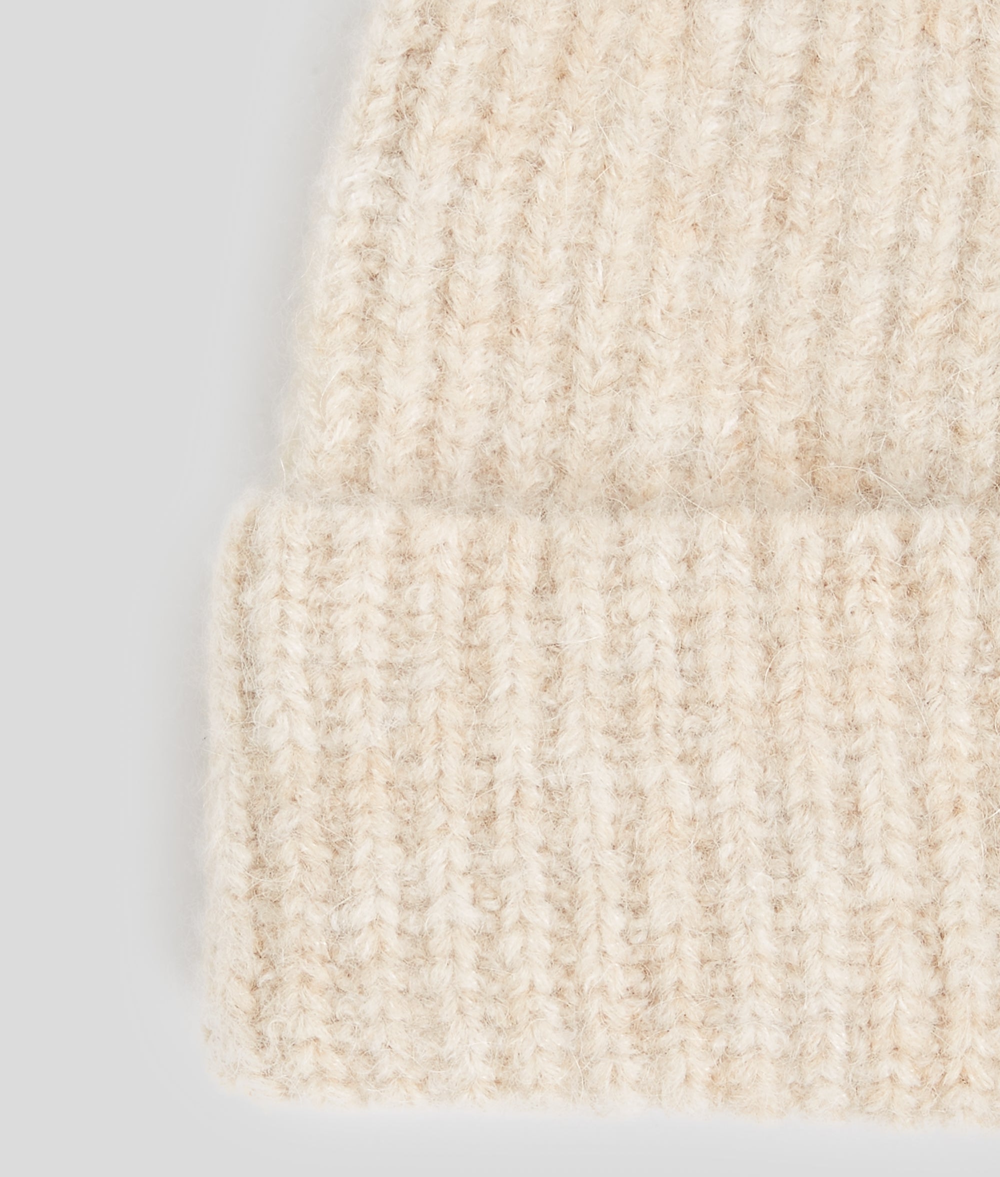 This beanie features a cozy rib-knit design. ensuring warmth and comfort. A playful pompom adds a fun touch. while the folded brim and KARL Autograph embellishment elevate its stylish appeal.