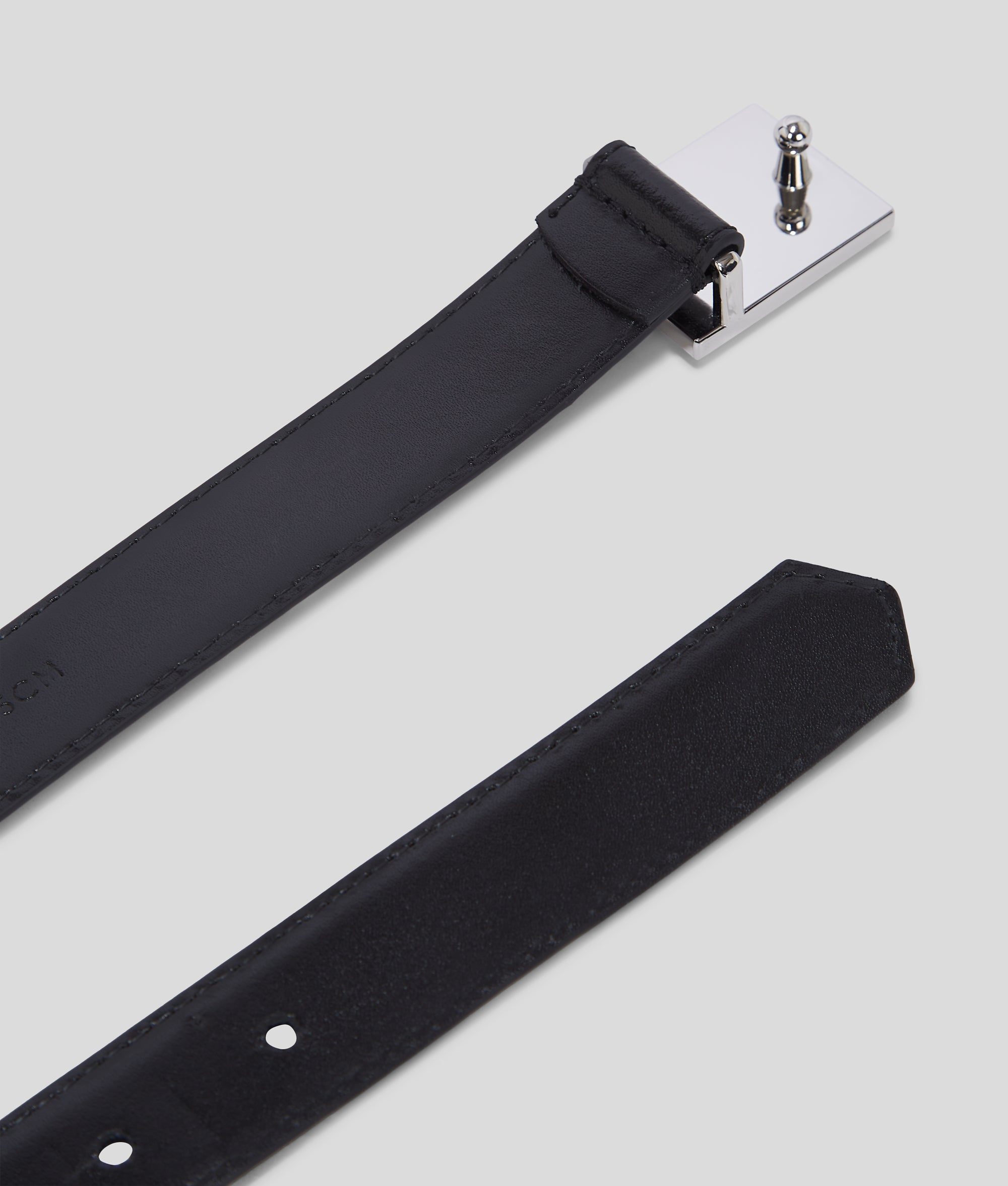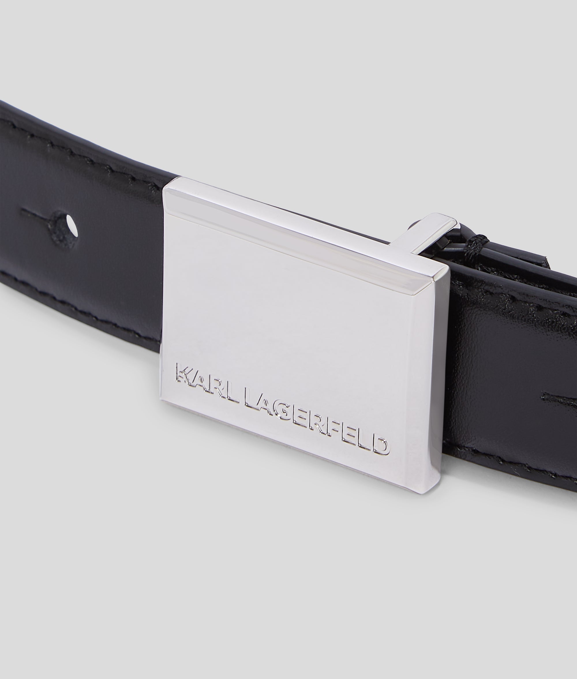 This luxe leather belt showcases a refined pin buckle closure and a square metal buckle adorned with the KARL LAGERFELD logo. Designed to harmonize seamlessly with the K/Forever collection. it exudes effortless style and sophistication.