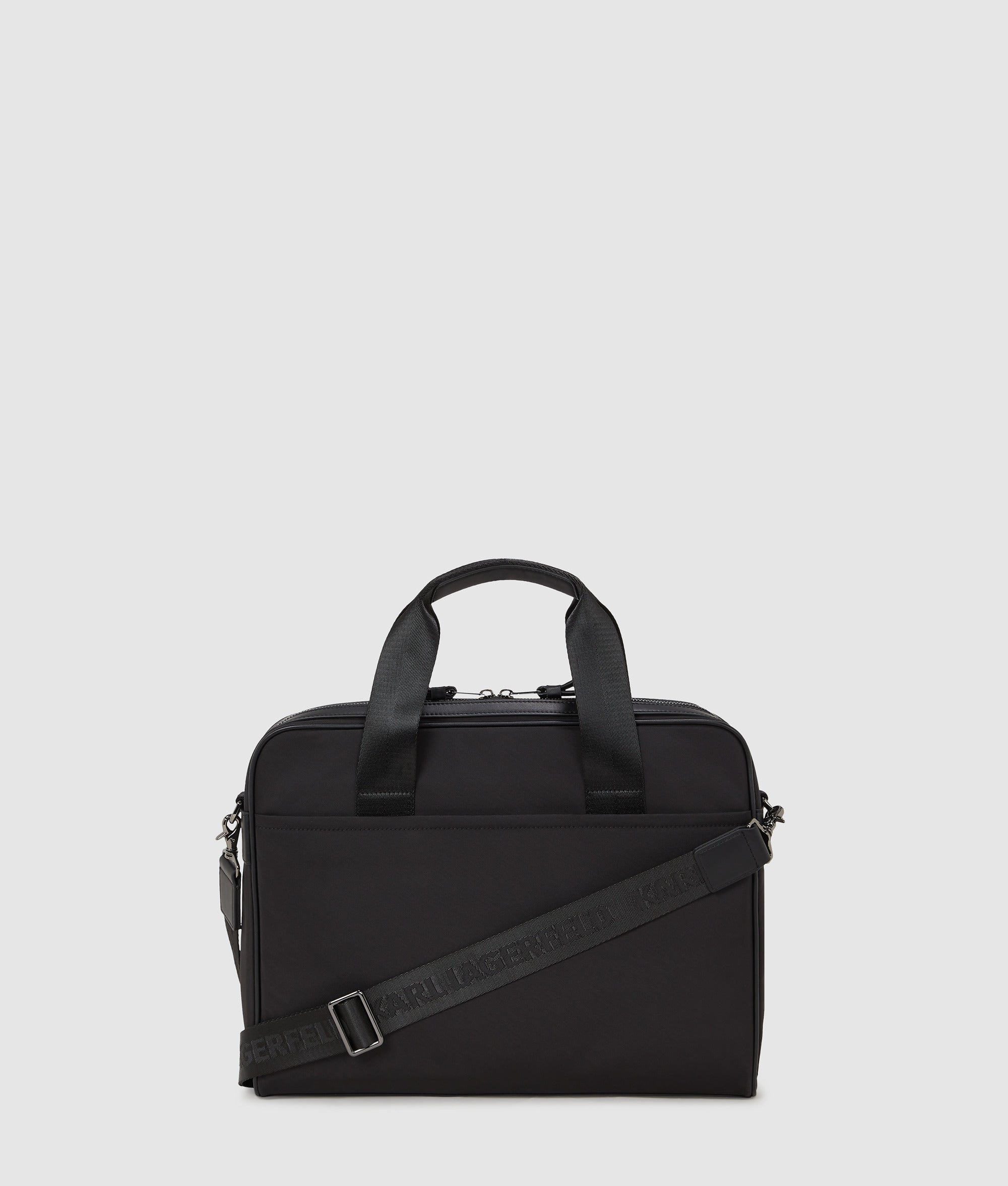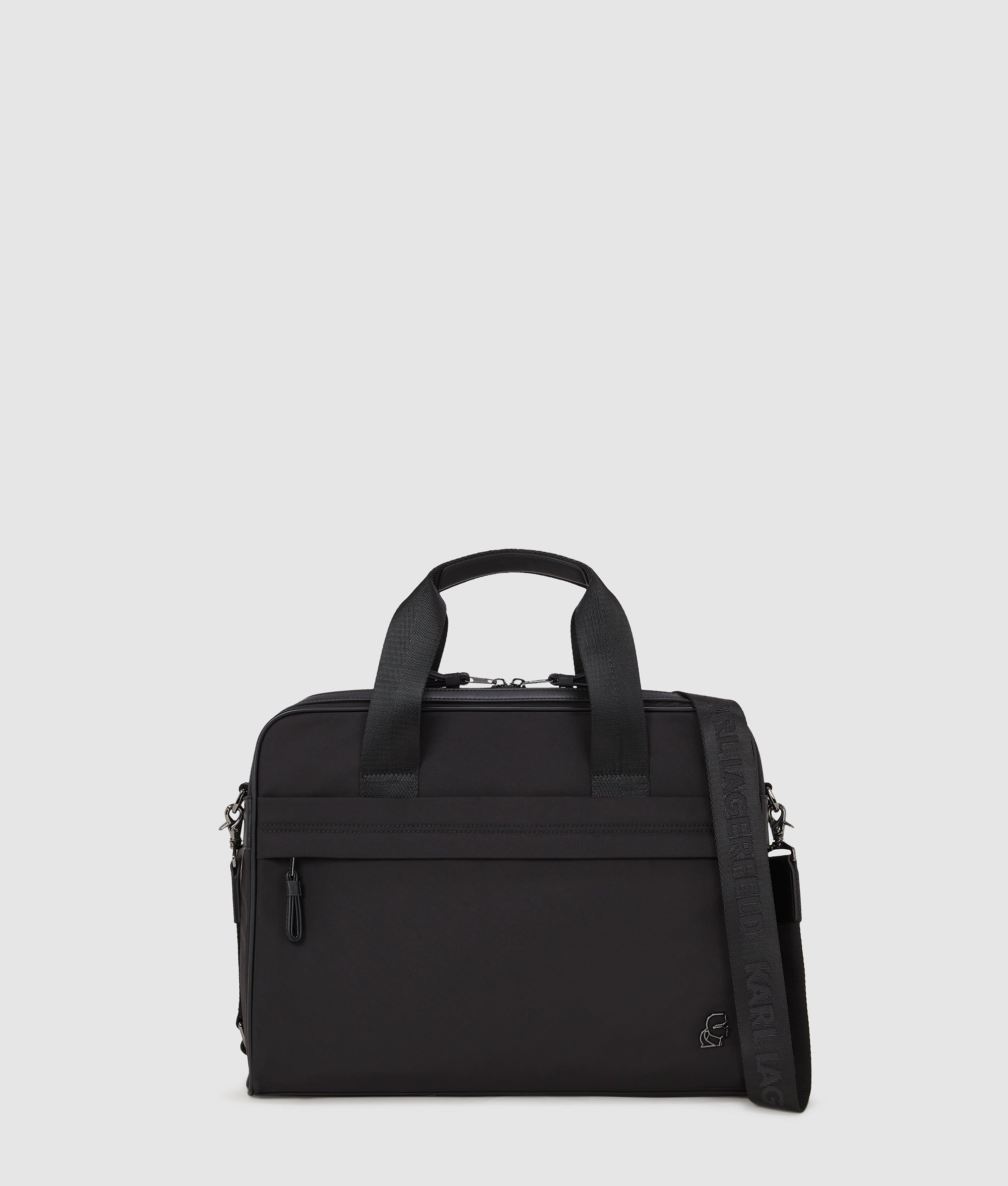 Elevate your professional wardrobe with this briefcase featuring a secure zip closure. front pocket. and twin handles with a detachable strap for easy carrying. Accented with the Karl Kameo motif. it marries style with functionality.