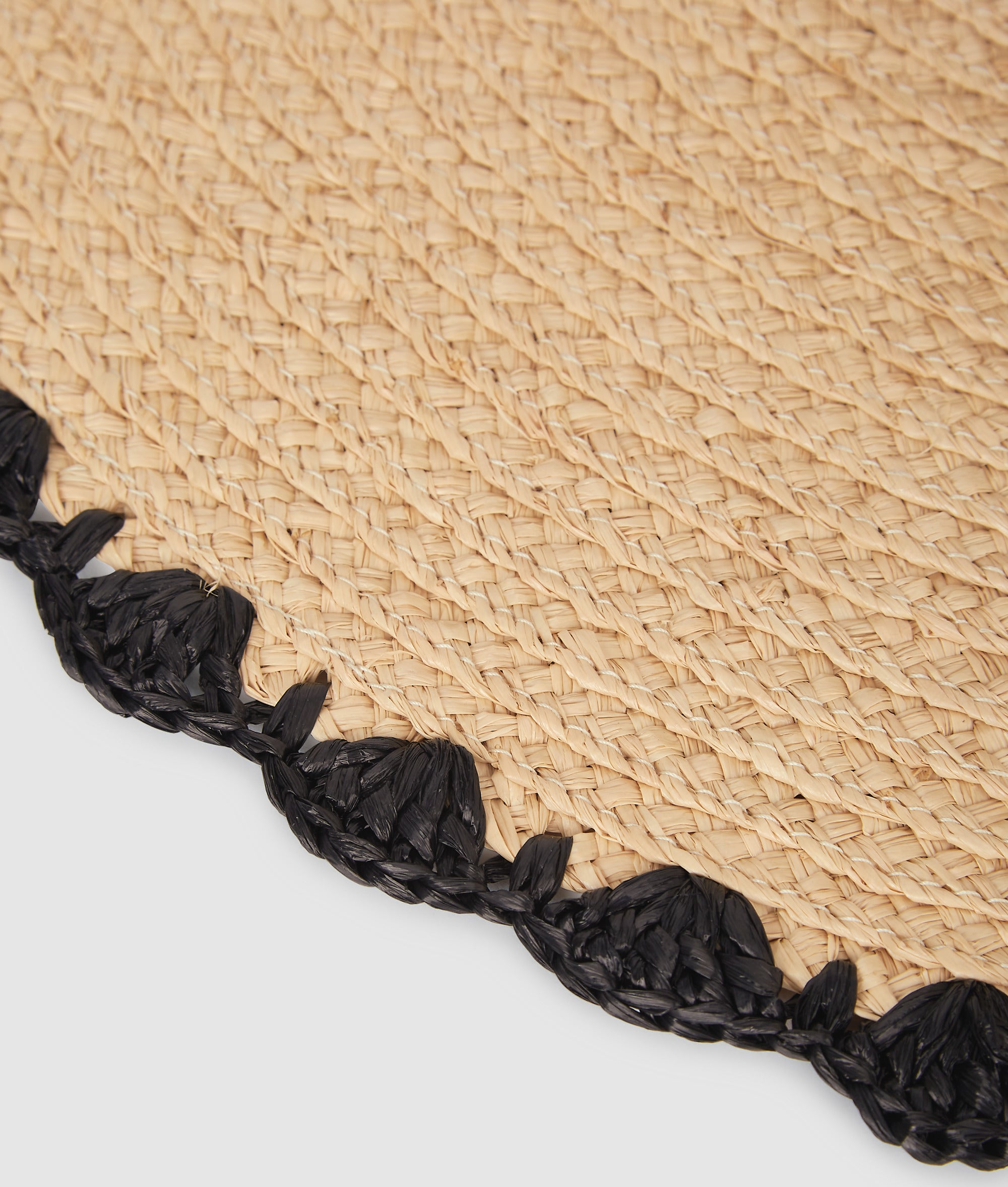 An ultra-chic beach hat with a wide. scalloped-edge brim to frame the face with effortless elegance.