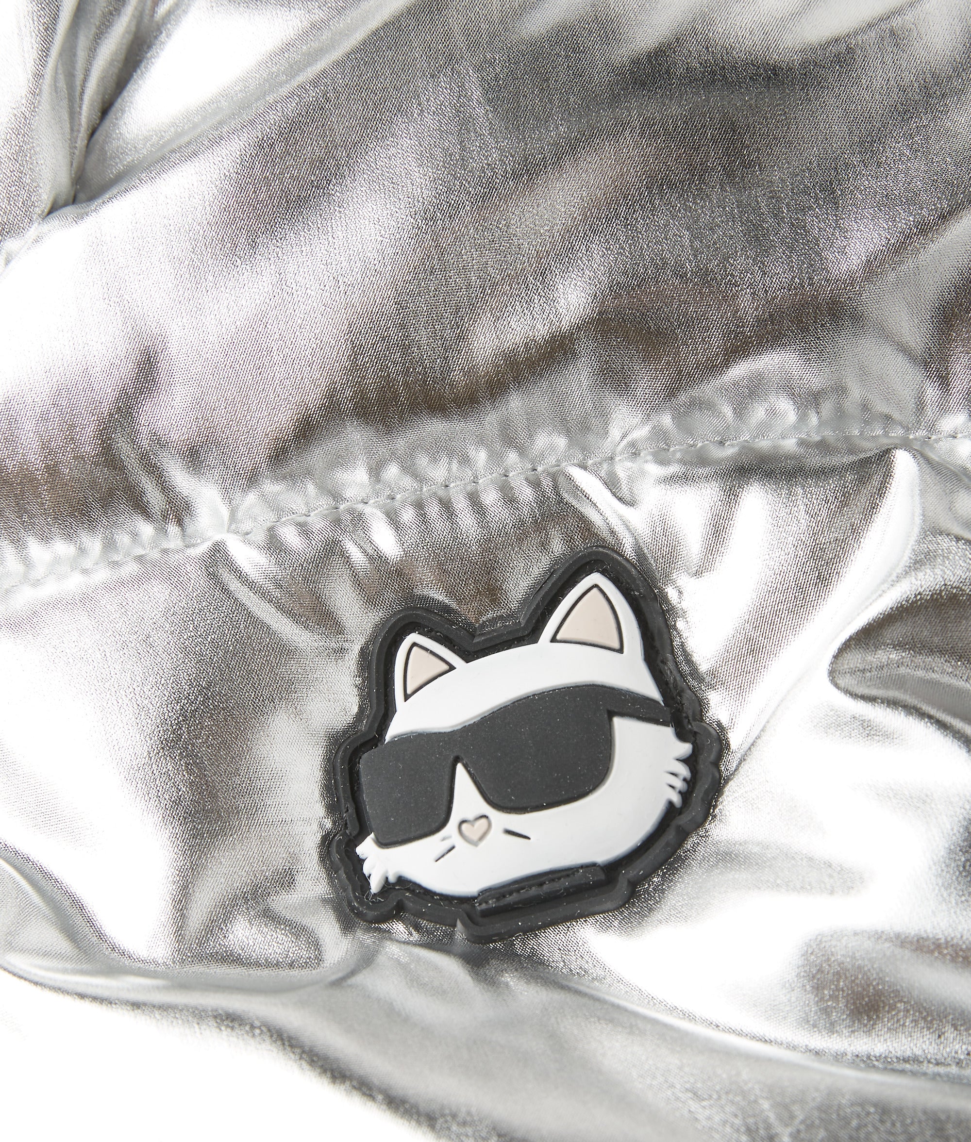 This metallic puffer jacket keeps little ones warm with padded comfort and a cozy hood. Finished with playful Choupette and logo artwork for standout winter style.