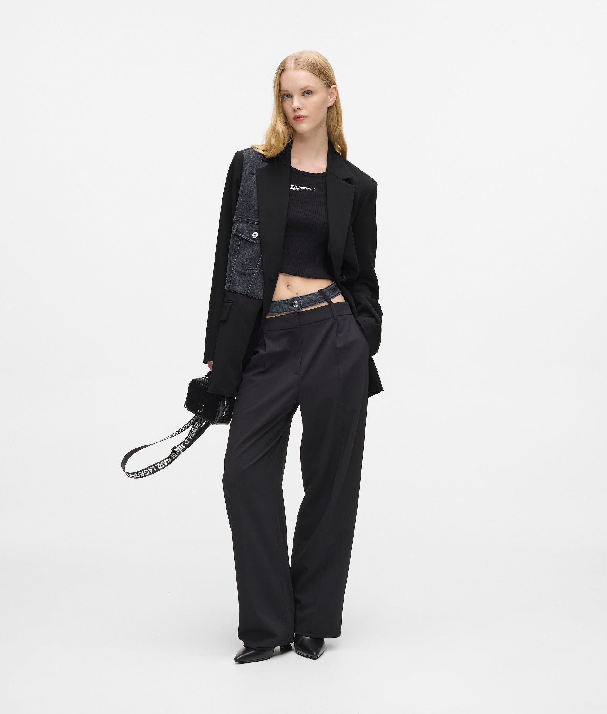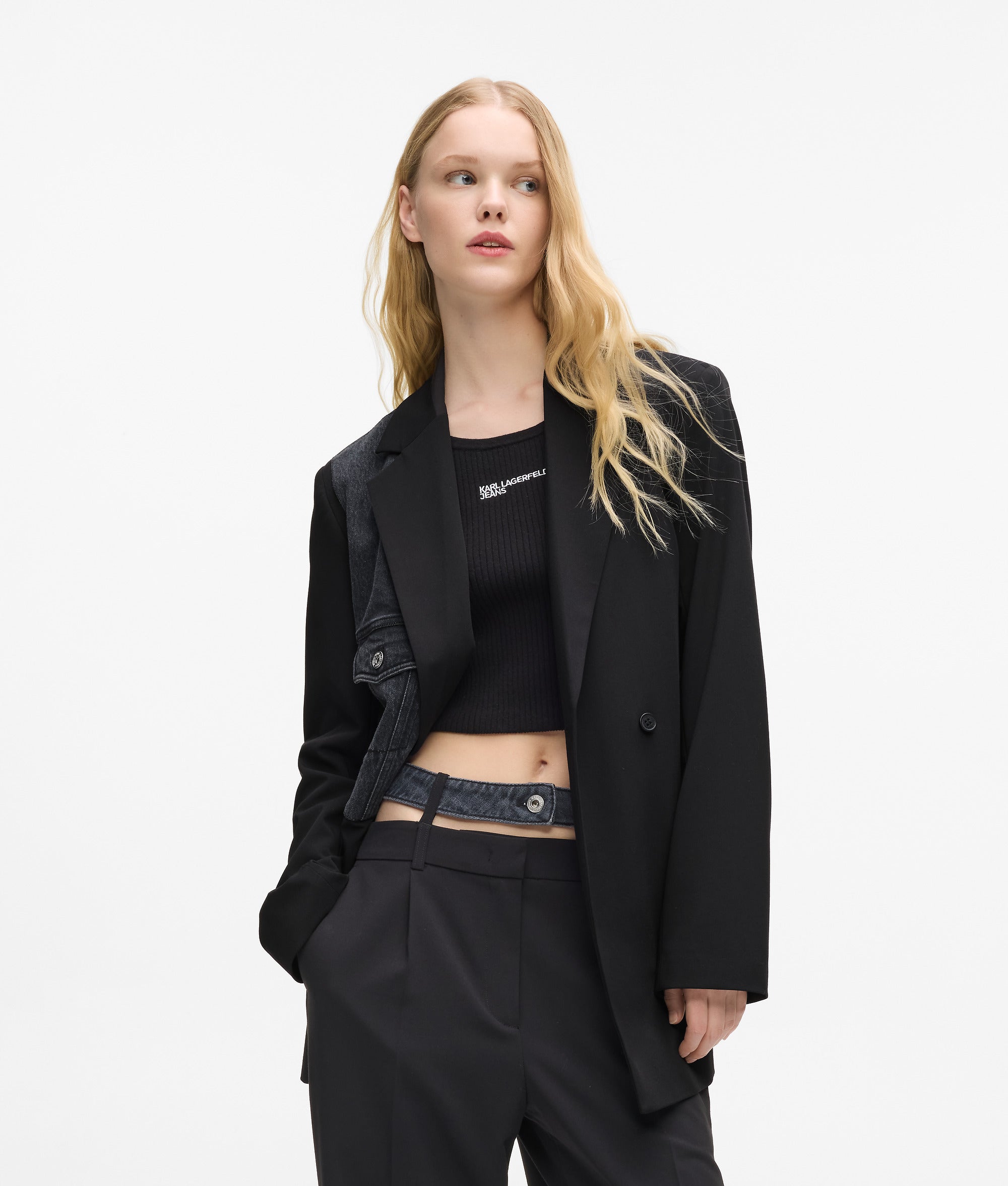 The double-breasted blazer blends woven fabric with a tonal denim panel. adding unexpected texture and depth while tailored pockets keep the silhouette sharp.