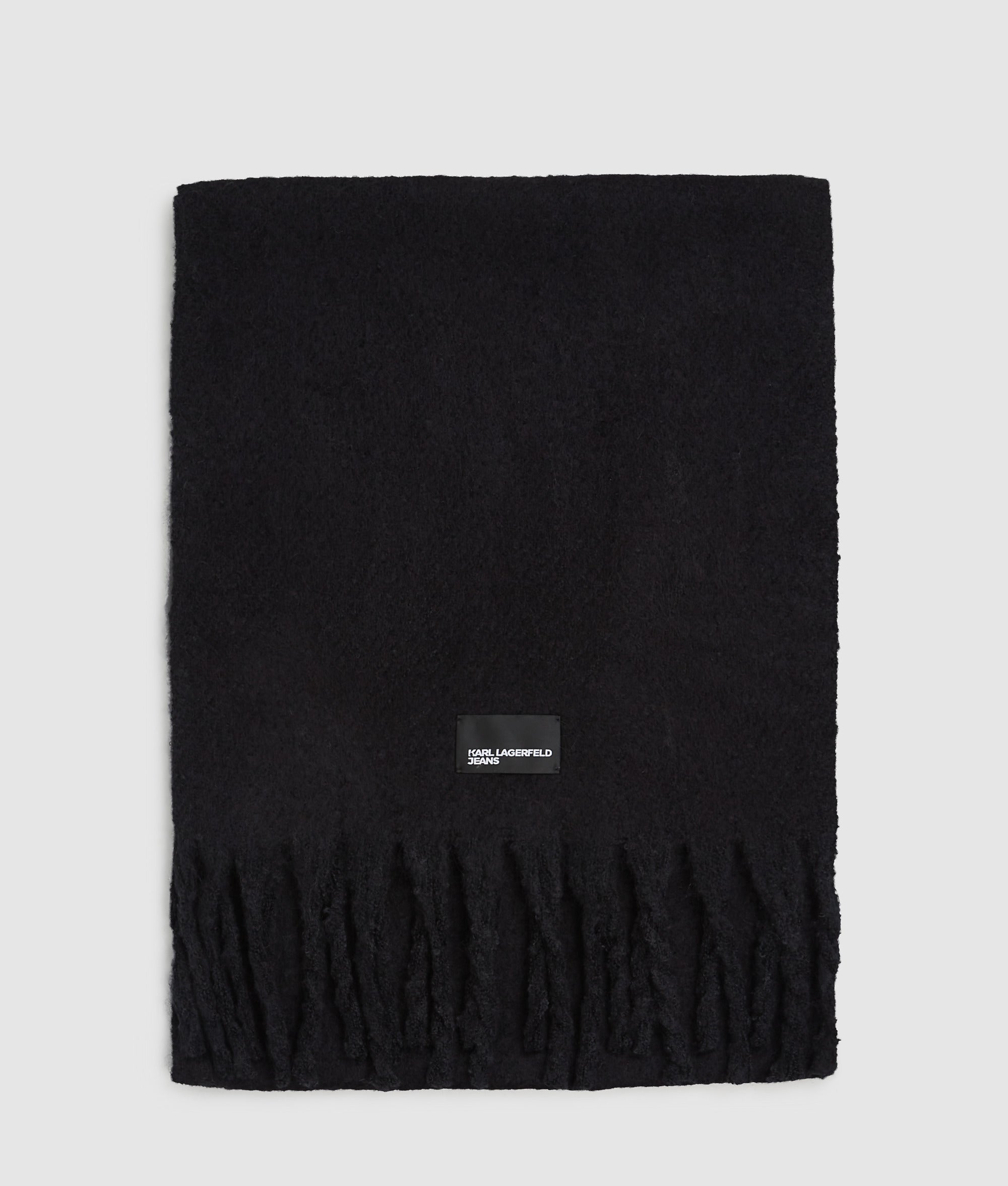 This cozy scarf features a playful fluffy texture. perfect for layering on colder days. Classic fringe detailing and a subtle KARL LAGERFELD JEANS logo patch add a touch of refinement.