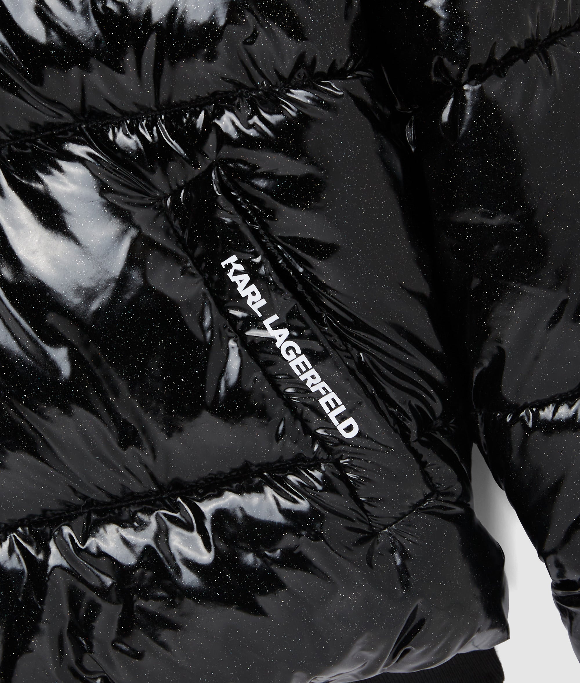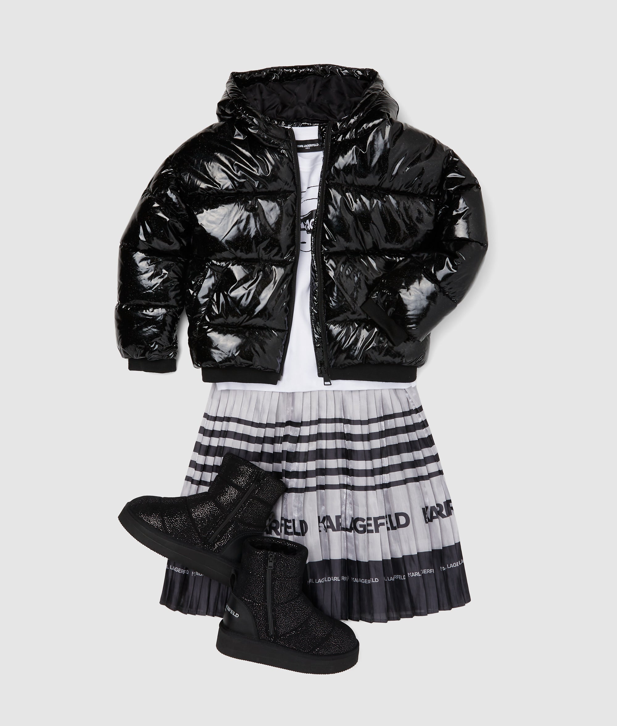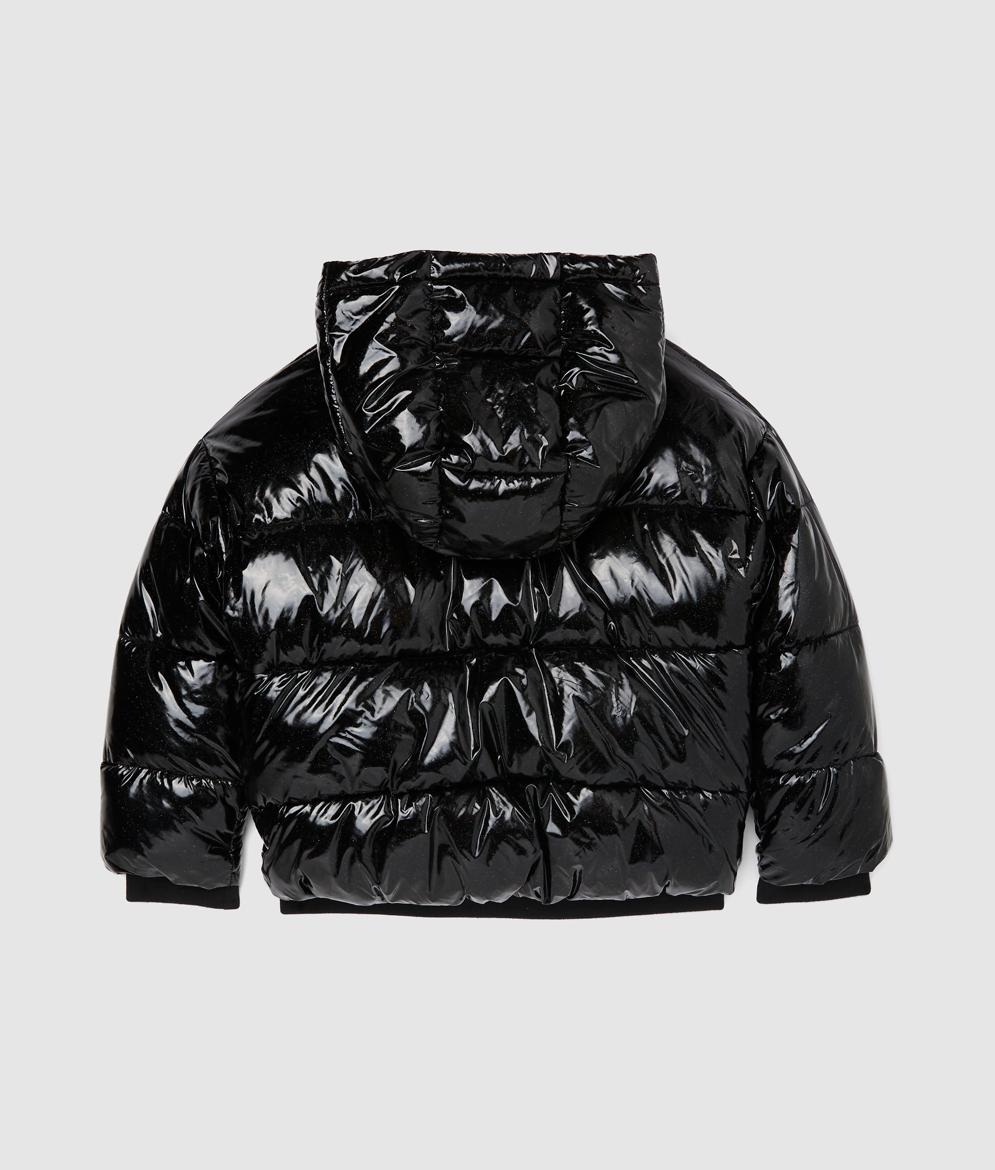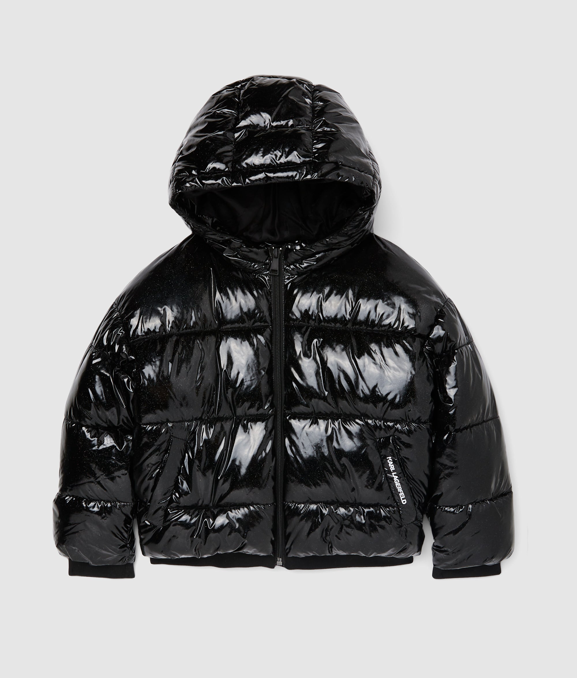 A down-filled puffer jacket with a cozy hood and ribbed cuffs that lock in warmth. Side pockets add practicality with subtle logo detail for a refined touch.