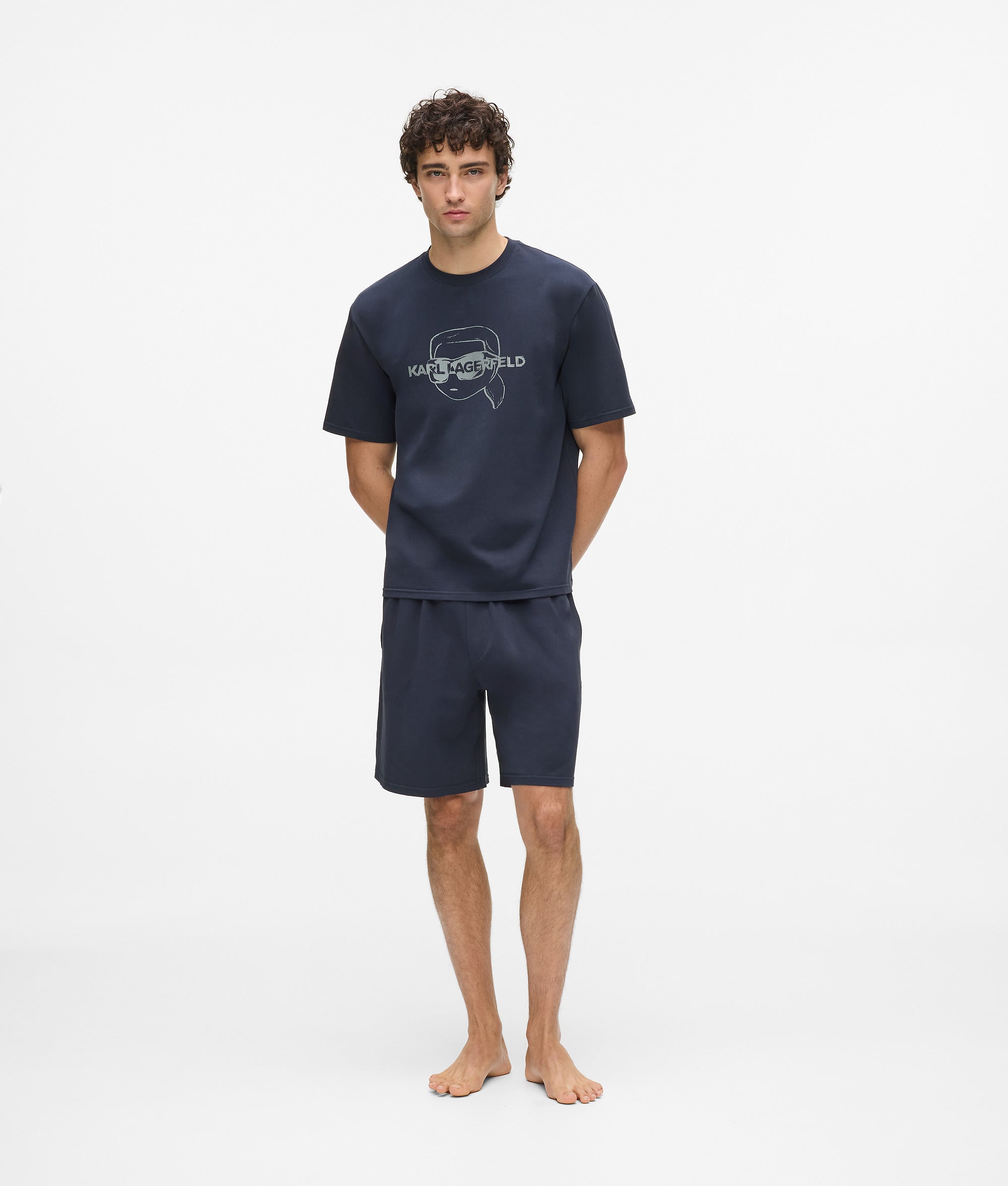 Designed for relaxed evenings. this crew-neck T-shirt and shorts pajama set offers breathable comfort with playful Ikon Karl artwork.