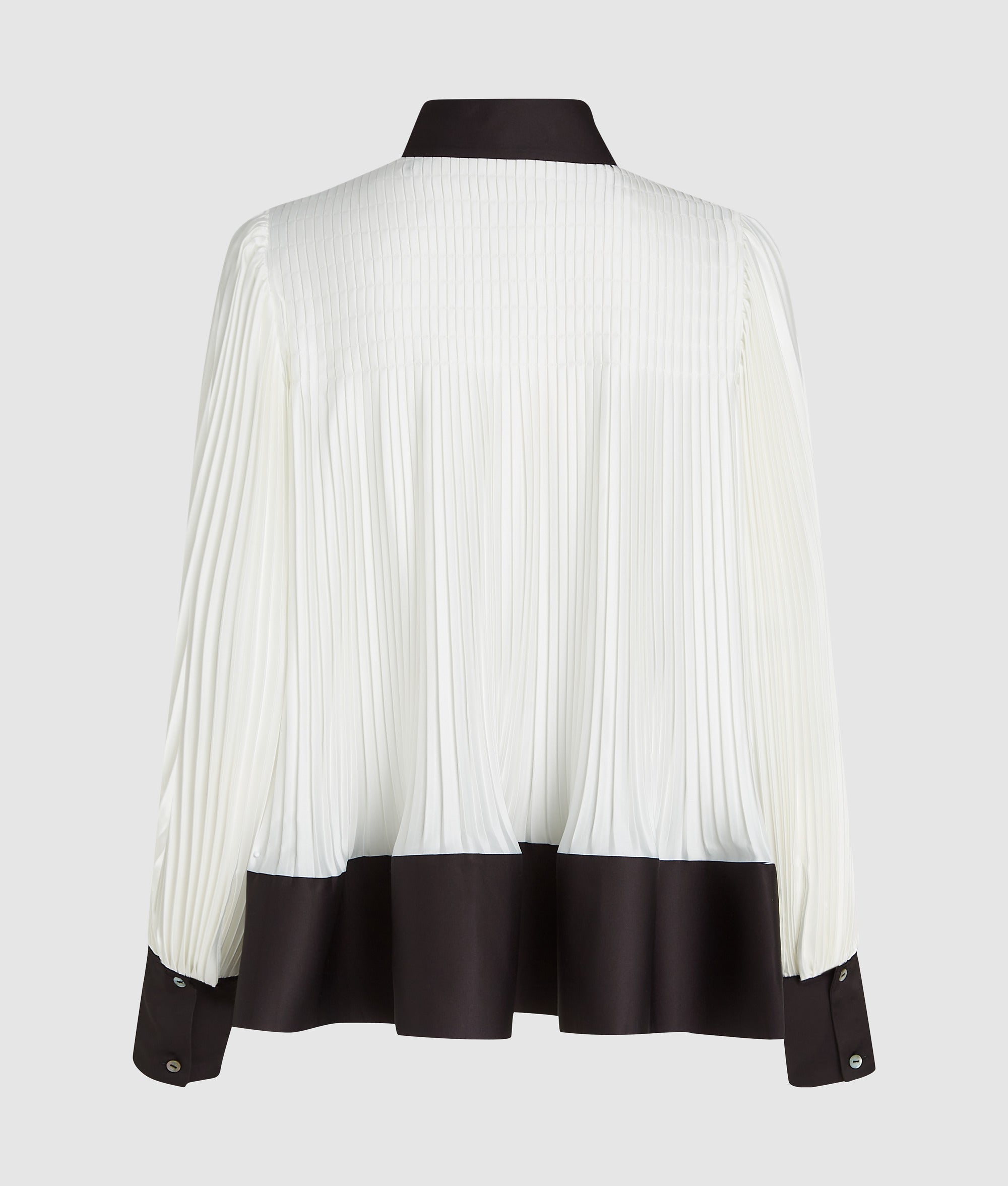 A fluid pleated shirt that moves with effortless grace. Contrasting details add a subtle edge to classic elegance.
