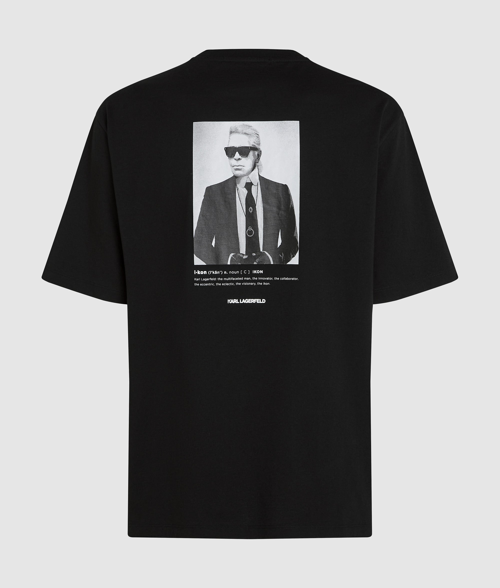 A casual favorite elevated by a fashion icon. This crew-neck T-shirt is understated at the front and bold at the back with artwork of the legendary Karl Lagerfeld.